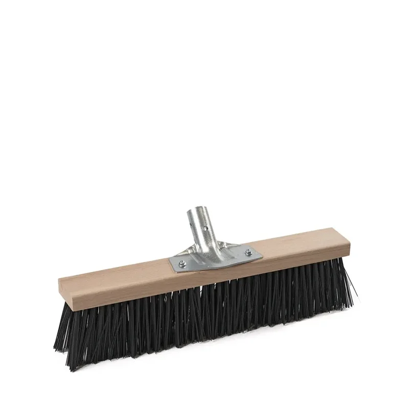 Scopa industriale con setole dure, supporto in legno e attacco in metallo. Senza manico.