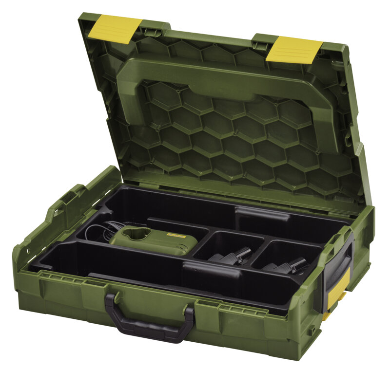 Set base per utensili a batteria LBX/A. L-BOXX estremamente piatta con due batterie agli ioni di litio Li/A2 e caricabatterie rapido LG/A2.